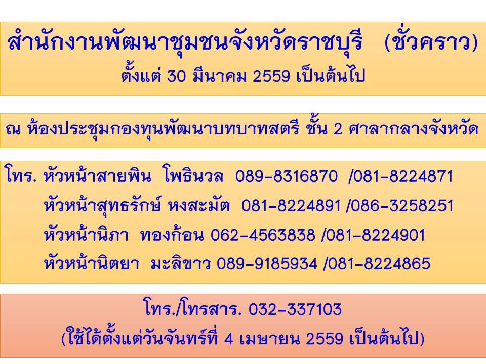 ประชาสัมพันธ์เปลี่ยนสถานที่ปฏิบัติงาน (ชั่วคราว) ณ ห้องประชุมกองทุนพัฒนาบทบาทสตรี ชั้น 2 ศาลากลางจังหวัดราชบุรี ตั้งแต่วันที่ 30 มีนาคม 2559 เป็นต้นไป สำหรับโทรศัพท์/โทรสาร สำนักงาน (032-337103) ใช้ได้ตั้งแต่วันจันทร์ที่ 4 เมษายน 2559 เป็นต้นไป