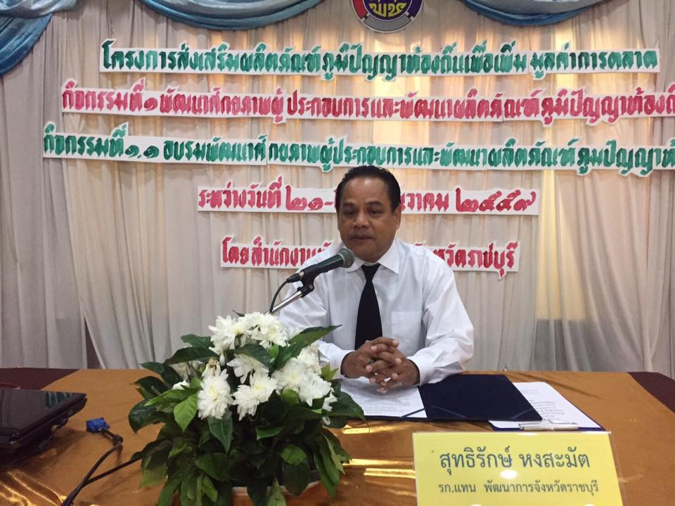 >>ราชบุรี<< วันนี้ 21 ธันวาคม 2559 เวลา 09.30 น. นายสุทธิรักษ์ หงสะมัต รักษาราชการแทนพัฒนาการจังหวัดราชบุรี เป็นประธานในการเปิดโครงการส่งเสริมผลิตภัณฑ์ภูมิปัญญาท้องถิ่นเพื่อเพิ่มมูลค่าการตลาด กิจกรรมที่ 1 พัฒนาศักยภาพผู้ประกอบการและพัฒนาผลิตภัณฑ์ภูมิปัญญาท้องถิ่น กิจกรรมที่ 1.1 อบรมพัฒนาศักยภาพผู้ประกอบการและพัฒนาผลิตภัณฑ์ภูมิปัญญาท้องถิ่น โดยนางสาวนิภา ทองก้อน หัวหน้ากลุ่มงานสารสนเทศฯ รักษาการในตำแหน่งหัวหน้ากลุ่มงานส่งเสริมการพัฒนาชุมชน เป็นผู้กล่าวรายงาน ซึ่งโครงการในครั้งนี้จัดอบรมระหว่างวัน 21-22 ธันวาคม 2559 โดยมีกลุ่มเป้าหมายคือ ผู้ประกอบการ OTOP กลุ่ม D กลุ่มละ 6 คน และเครือข่าย OTOP และ จนท. พัฒนาชุมชน รวมทั้งสิ้น 80 คน ณ ห้องเพชรชมพู โรงแรมโกลเด้นซิตี้ จังหวัดราชบุรี