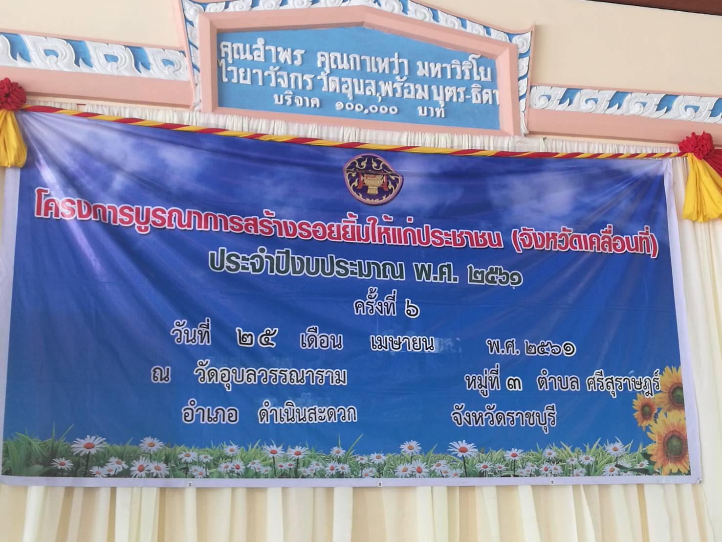วันที่ 25 เมษายน 2561 ณ วัดอุบลวรรณาราม หมู่ที่ 3 ตำบลศรีสุราษฎ์ อำเภอดำเนินสะดวก จังหวัดราชบุรี นายสุทธิรักษ์ หงสะมัต พัฒนาการจังหวัดราชบุรี พร้อมด้วยเจ้าหน้าที่ผู้เกี่ยวข้อง ได้ออกหน่วยบริการจัดกิจกรรมสาธิตอาชีพชุมชน ในโครงการบูรณาการสร้างรอยยิ้มให้กับประชาชน (จังหวัดเคลื่อนที่ ประจำปีงบประมาณ 2561) ครั้งที่ 6 จัดโดย จังหวัดราชบุรี