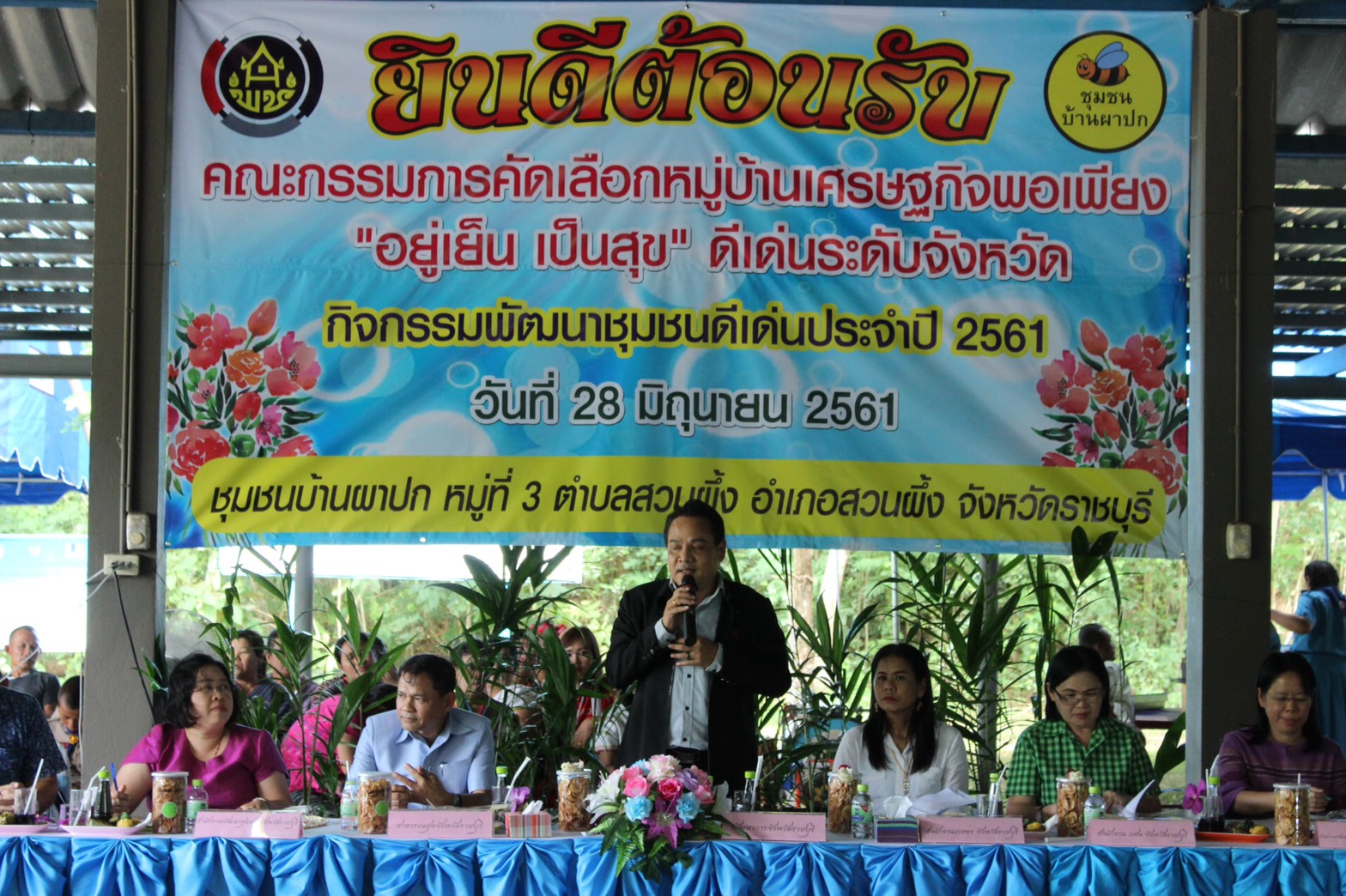 วันที่ 28 มิถุนายน 2561 เวลา 13.00 น. ณ บ้านผาปก ตำบลสวนผึ้ง อำเภอสวนผึ้ง จังหวัดราชบุรี นายวิสิษฎ์ พวงเพชร รองผู้ว่าราชการจังหวัดราชบุรี มอบให้ นายสุทธิรักษ์ หงสะมัต พัฒนาการจังหวัดราชบุรี เป็นประธานคณะกรรมการคัดสรรหมู่บ้านเศรษฐกิจพอเพียง “อยู่เย็น เป็นสุข” และกิจกรรมพัฒนาชุมชนดีเด่น จังหวัดราชบุรี ประจำปี 2561 พร้อมด้วยคณะกรรมการฯ ลงพื้นที่เพื่อพิจารณาคัดเลือกหมู่บ้านเศรษฐกิจพอเพียง “อยู่เย็น เป็นสุข” ระดับจังหวัด ณ บ้านผาปก ตำบลสวนผึ้ง อำเภอสวนผึ้ง จังหวัดราชบุรี โดยมีหัวหน้าส่วนราชการ ผู้บริหารท้องถิ่น/ท้องที่ กลุ่ม/องค์กร และประชาชน ให้การต้อนรับและให้ข้อมูลในการนี้หมู่บ้านได้นำเสนอข้อมูล จุดเด่นต่างๆ เกี่ยวกับการบริหารจัดการชุมชน และนำคณะกรรมการฯ ลงพื้นที่