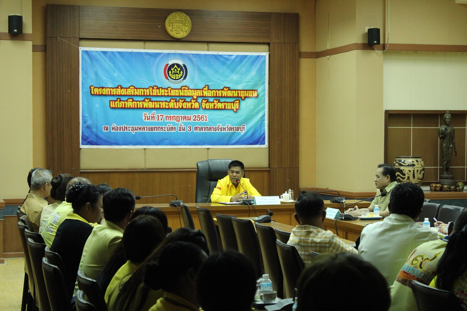 วันที่ 17 กรกฎาคม 2561 เวลา 09.00 น. ณ ห้องประชุมหลวงยกกระบัตร ชั้น 3 ศาลากลางจังหวัดราชบุรี นายชยาวุธ จันทร ผู้ว่าราชการจังหวัดราชบุรี มอบหมายให้นายวิสิษฎ์ พวงเพชร รองผู้ว่าราชการจังหวัดราชบุรี เป็นประธานในพิธีเปิดโครงการส่งเสริมการใช้ประโยชน์ข้อมูลเพื่อการพัฒนาชุมชนแก่ภาคีการพัฒนา ระดับจังหวัด ปี 2561 พร้อมมอบโล่รางวัลให้แก่ผู้จัดเก็บข้อมูลดีเด่น ผู้บันทึกข้อมูลดีเด่น และองค์กรปกครองส่วนท้องถิ่นดีเด่นด้านการบริหารการจัดเก็บและนำข้อมูล จปฐ. ไปใช้ประโยชน์ดีเด่น ระดับจังหวัด