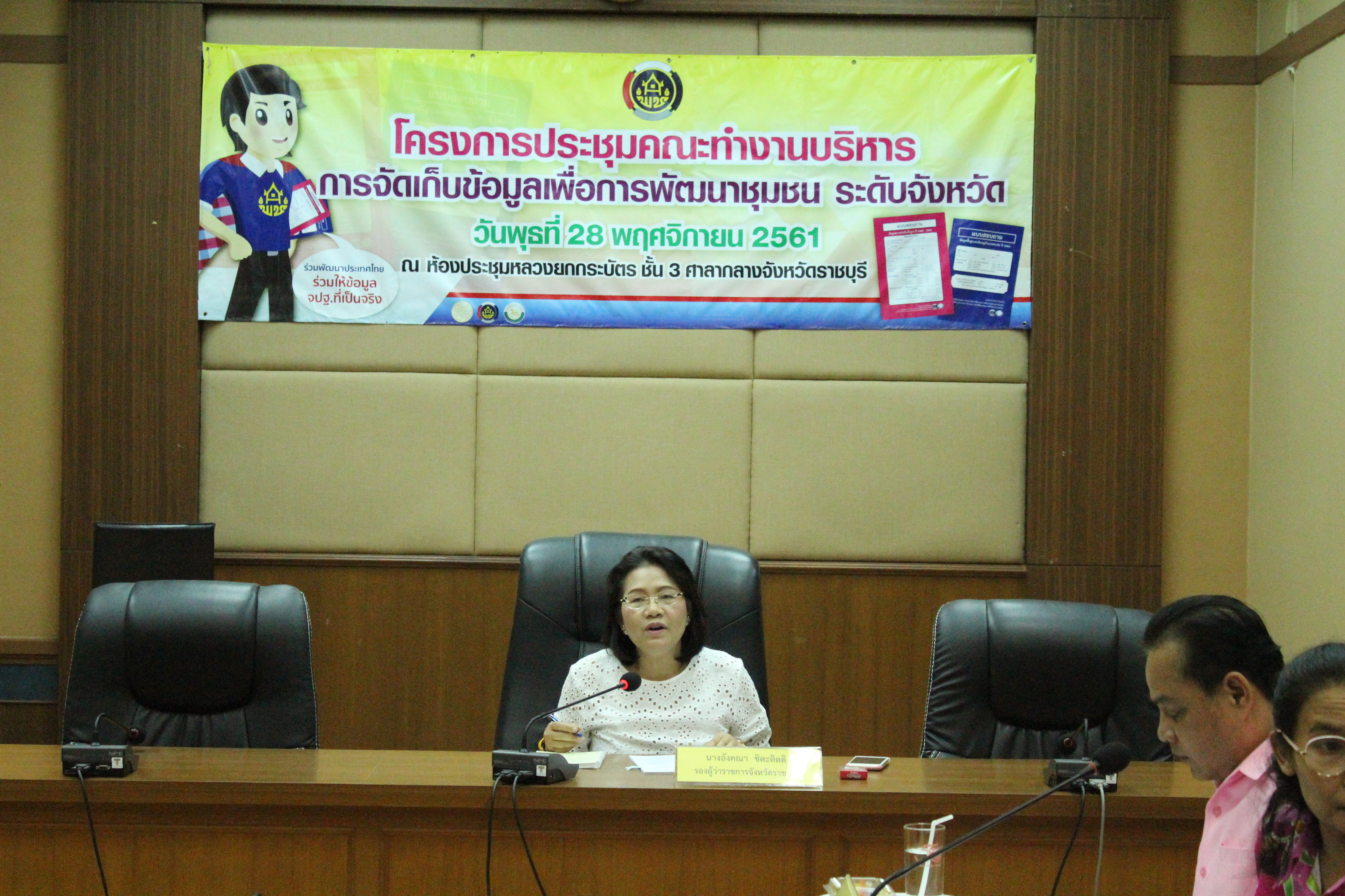วันที่ 28 พฤศจิกายน 2561 เวลา 13.30 น. ณ ห้องประชุมหลวงยกกระบัตร ศาลากลางจังหวัดราชบุรี สำนักงานพัฒนาชุมชนจังหวัดราชบุรีจัดประชุมคณะทำงานบริหารการจัดเก็บข้อมูลเพื่อการพัฒนาชุมชน ระดับจังหวัด โดยมี นางอังคณา ชิตะติตติ รองผู้ว่าราชการจังหวัดราชบุรี เป็นประธานการประชุม โดยระเบียบวาระการประชุมแจ้งให้ทราบถึงผลการดำเนินงานจัดเก็บข้อมูลเพื่อการพัฒนาชุมชนในปีที่ผ่านมา พร้อมแนวทางบริหารการจัดเก็บข้อมูลเพื่อการพัฒนาชุมชน ระดับจังหวัด ในปี 2562