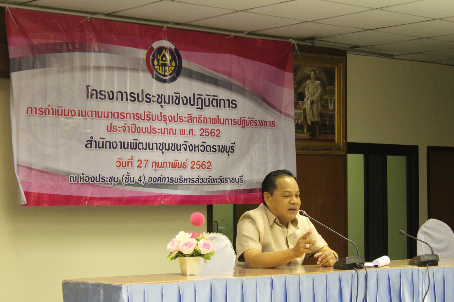 วันที่ 27 กุมภาพันธ์ 2562 เวลา 09.00 น. ณ ห้องประชุม(ชั้น4) องค์การบริหารส่วนจังหวัดราชบุรี อำเภอเมืองราชบุรี จังหวัดราชบุรี นายสุทธิรักษ์ หงสะมัต พัฒนาการจังหวัดราชบุรี เป็นประธานการประชุมเชิงปฏิบัติการการดำเนินงานตามมาตรการปรับปรุงประสิทธิภาพในการปฏิบัติราชการ ประจำปีงบประมาณ พ.ศ. 2562 การประเมินส่วนราชการและการประเมินผลการปฏิบัติราชการของพัฒนาการจังหวัด พร้อมลงนามบันทึกข้อตกลงตามตัวชี้วัดและค่าเป้าหมายการประเมินผลการปฏิบัติราชการ ของสำนักงานพัฒนาชุมชนจังหวัดราชบุรี ประจำปีงบประมาณ พ.ศ.2562 โดยมี หัวหน้ากลุ่มงาน หัวหน้าฝ่าย พัฒนาการอำเภอ และเจ้าหน้าที่พัฒนาชุมชนทุกคน เข้าร่วมรับฟังคำชี้แจงพร้อมร่วมลงนามบันทึกข้อตกลงในครั้งนี้ด้วย