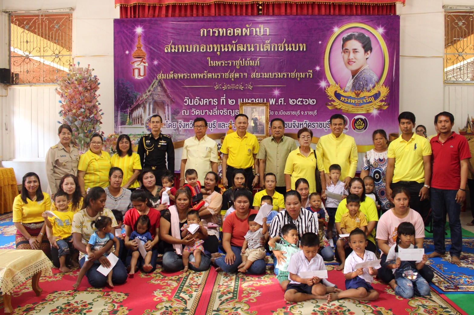 วันที่ 2 เมษายน 2562 เวลา 10.00 น. ณ วัดบางลี่เจริญธรรม อำเภอเมืองราชบุรี จังหวัดราชบุรี นายชยาวุธ จันทร ผู้ว่าราชการจังหวัดราชบุรี มอบหมายให้ นายวีรัส ประเศรษโฐ รองผู้ว่าราชการจังหวัดราชบุรี เป็นประธานทอดผ้าป่าสมกองทุนพัฒนาเด็กชนบทในพระราชูปถัมภ์สมเด็จพระเทพรัตนราชสุดาฯ สยามบรมราชกุมารี โดยนายสุทธิรักษ์ หงสะมัต พัฒนาการจังหวัดราชบุรี มอบหมายให้ นางสาวนิภา ทองก้อน หัวหน้ากลุ่มงานยุทธศาสตร์การพัฒนาชุมชนกล่าวรายงาน  ผู้เข้าร่วมกิจกรรมประกอบด้วย หัวหน้าส่วนราชการจากทุกภาคส่วน กลุ่มองค์กร ข้าราชการในสังกัดสำนักงานพัฒนาชุมชนจังหวัดราชบุรี  พิธีทอดผ้าป่าสมทบกองทุนพัฒนาเด็กชนบทในพระราชูปถัมภ์ สมเด็จพระเทพรัตนราชสุดาฯสยามบรมราชกุมารี  จัดขึ้นทั้งส่วนกลางและภูมิภาคทุกจังหวัด โดยมีวัตถุประสงค์เพื่อเป็นกองทุนในการให้ความช่วยเหลือและสนับสนุนการพัฒนาเด็กก่อนวัยเรียน อายุตั้งแต่แรกเกิดถึงหกปี ที่ครอบครัวยากจนและด้อยโอกาส ให้ได้รับการเลี้ยงดูอย่างถูกต้องเหมาะสมกับวัย ทั้งทางร่างกาย จิตใจ สังคม และสติปัญญา สำหรับในการทอดผ้าป่าในครั้งนี้ มีผู้มีจิตศรัทธานำเงินมาร่วมทำบุญ เป็นเงิน 201,294 บาท