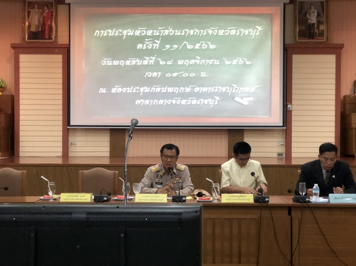 วันที่ 29 พฤศจิกายน 2562 เวลา 10.00 น. ณ ห้องประชุมกัลปพฤกษ์ อาคารราชบุรีเกมส์ นายชยาวุธ จันทร ผู้ว่าราชการจังหวัดราชบุรี เป็นประธานการประชุมหัวหน้าส่วนราชการครั้งที่ 11/2562 โดยมีหัวหน้าส่วนราชการทุกส่วนราชการ นายอำเภอทุกอำเภอ เข้าร่วมประชุม เพื่อรับทราบผลการดำเนินงานที่ผ่านมา พร้อมรับทราบ นโยบายสำคัญของจังหวัด