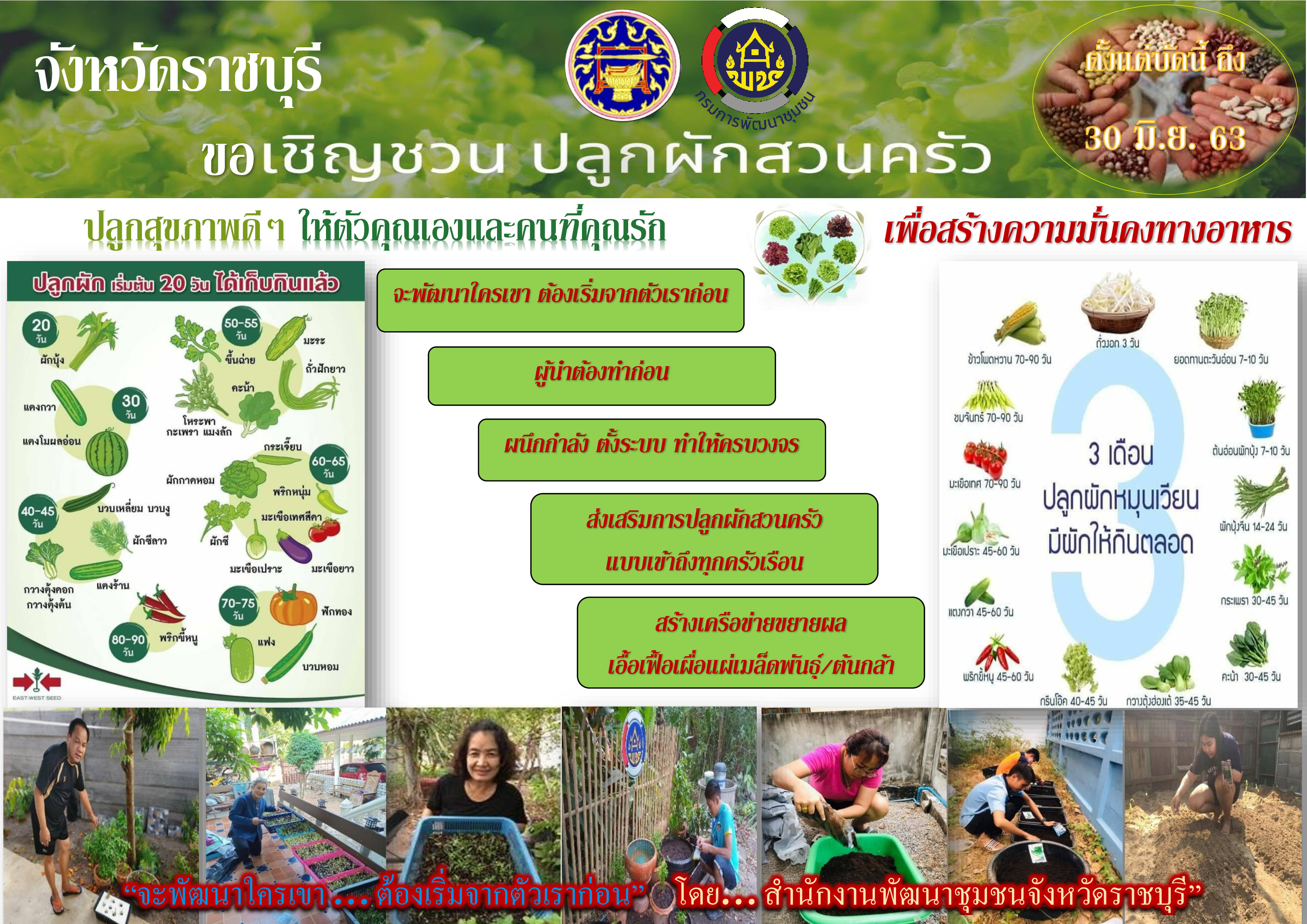 สำนักงานพัฒนาชุมชนจังหวัดราชบุรี ขับเคลื่อนแผนปฏิบัติการ 90 วัน “ปลูกผักสวนครัว เพื่อสร้างความมั่นคงทางอาหาร” โดยกำหนดให้เจ้าหน้าที่พัฒนาชุมชนทุกคนเริ่มดำเนินการตามโครงการขับเคลื่อนแผนปฏิบัติการ 90 วัน โดยการปลูกผักสวนครัวอย่างน้อย 5 ชนิด เพื่อเป็นตัวอย่างแก่ประชาชนและสร้างกระบวนการเรียนรู้ในระดับบุคคลก่อนลงไปส่งเสริมให้ประชาชน “จะพัฒนาใครเขาต้องเริ่มจากตัวเราก่อน” เริ่มตั้งแต่บัดนี้ ถึง 30 มิถุนายน 2563