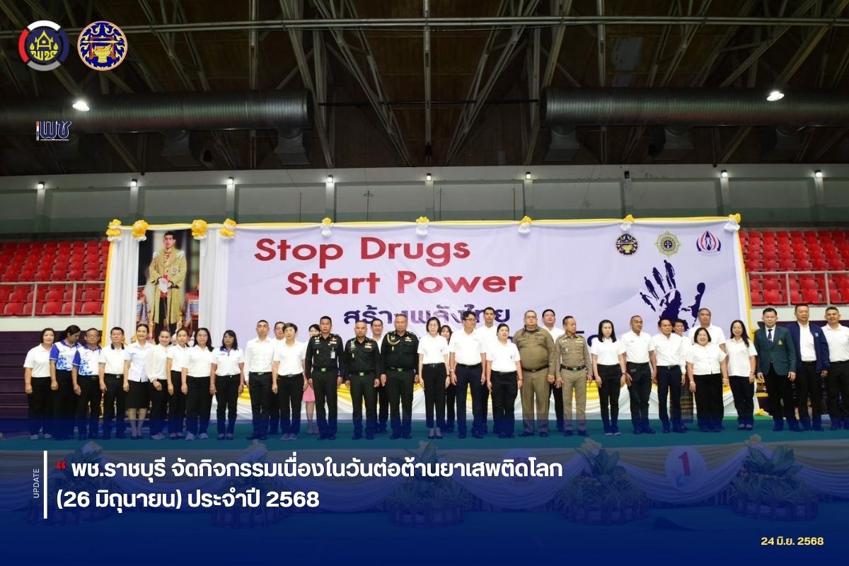 💠 วันที่ 24 มิถุนายน 2568 เวลา 08.30 น. ณ โรงยิมเนเซี่ยม อ.เมือง จ.ราชบุรี นางสาวฐิติลักษณ์ คำพา ผู้ว่าราชการจังหวัดราชบุรี เป็นประธานในการเปิดงาน พร้อมด้วยส่วนราชการ ภาคเอกชนและประชาชนจังหวัดราชบุรี ร่วมประกาศเจตนารมณ์และปฏิญาณตนเพื่อต่อต้านยาเสพติด เนื่องในวันต่อต้านยาเสพติดโลก (26 มิถุนายน) ประจำปี 2568 ภายใต้แนวคิด “Stop Drugs, Start Power สร้างพลังไทย หยุดภัยยาเสพติด”