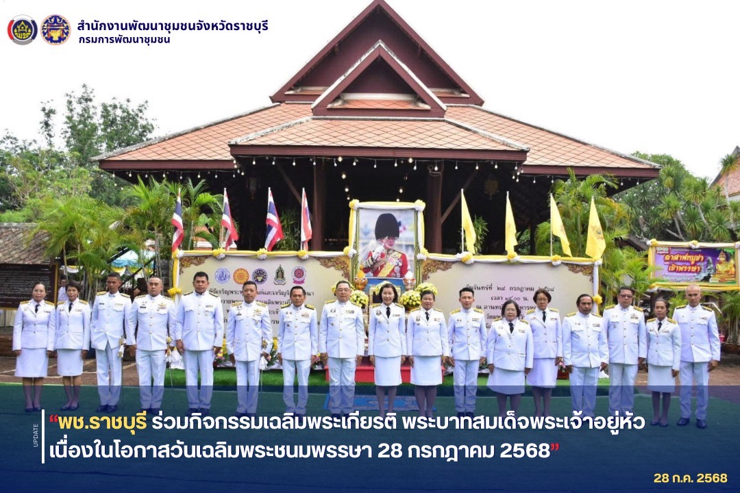 💠 นางทศมนพร พุทธจันทรา พัฒนาการจังหวัดราชบุรี พร้อมด้วย เจ้าหน้าที่พัฒนาชุมชนจังหวัดราชบุรี ร่วมกิจกรรมเฉลิมพระเกียรติ พระบาทสมเด็จพระเจ้าอยู่หัว เนื่องในโอกาสวันเฉลิมพระชนมพรรษา 28 กรกฎาคม 2568 โดยมี นางสาวฐิติลักษณ์ คำพา ผู้ว่าราชการจังหวัดราชบุรี เป็นประธาน โดยมี หัวหน้าส่วนราชการ ราชการ และประชาชนจังหวัดราชบุรี เข้าร่วม เพื่อแสดงออกถึงความจงรักภักดี สำนึกในพระมหากรุณาธิคุณอันหาที่สุดมิได้ ที่ทรงปฏิบัติบำเพ็ญพระราชกรณียกิจนานัปการ ด้วยพระราชวิริยอุตสาหะ เพื่อสร้างประโยชน์สุขแก่อาณาราษฎร ให้มีความสุขสวัสดิ์ มีคุณภาพชีวิตที่ดีอย่างพอเพียงและยั่งยืน ทรงสืบสาน รักษา และต่อยอดศาสตร์พระราชา แห่งสมเด็จพระบรมชนกนาถ ด้วยพระราชปณิธานอันแน่วแน่ เพื่อบำบัดทุกข์ บำรุงสุข แก่พสกนิกรชาวไทยตลอดมา ซึ่งมีกิจกรรม ดังนี้