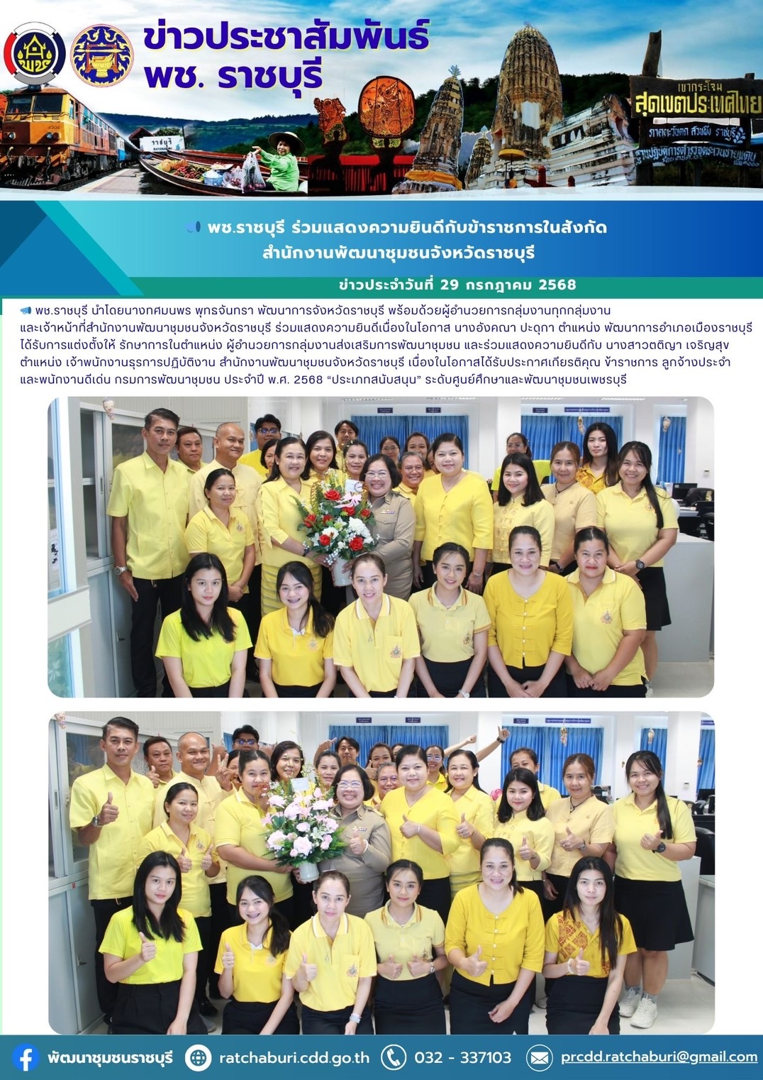 พช.ราชบุรี นำโดยนางทศมนพร พุทธจันทรา พัฒนาการจังหวัดราชบุรี พร้อมด้วยผู้อำนวยการกลุ่มงานทุกกลุ่มงาน และเจ้าหน้าที่สำนักงานพัฒนาชุมชนจังหวัดราชบุรี ร่วมแสดงความยินดีเนื่องในโอกาส นางอังคณา ปะดุกา ตำแหน่ง พัฒนาการอำเภอเมืองราชบุรี ได้รับการแต่งตั้งให้ รักษาการในตำแหน่ง ผู้อำนวยการกลุ่มงานส่งเสริมการพัฒนาชุมชน และร่วมแสดงความยินดีกับ นางสาวตติญา เจริญสุข ตำแหน่ง เจ้าพนักงานธุรการปฏิบัติงาน สำนักงานพัฒนาชุมชนจังหวัดราชบุรี เนื่องในโอกาสได้รับประกาศเกียรติคุณ ข้าราชการ ลูกจ้างประจำ และพนักงานดีเด่น กรมการพัฒนาชุมชน ประจำปี พ.ศ. 2568 “ประเภทสนับสนุน” ระดับศูนย์ศึกษาและพัฒนาชุมชนเพชรบุรี