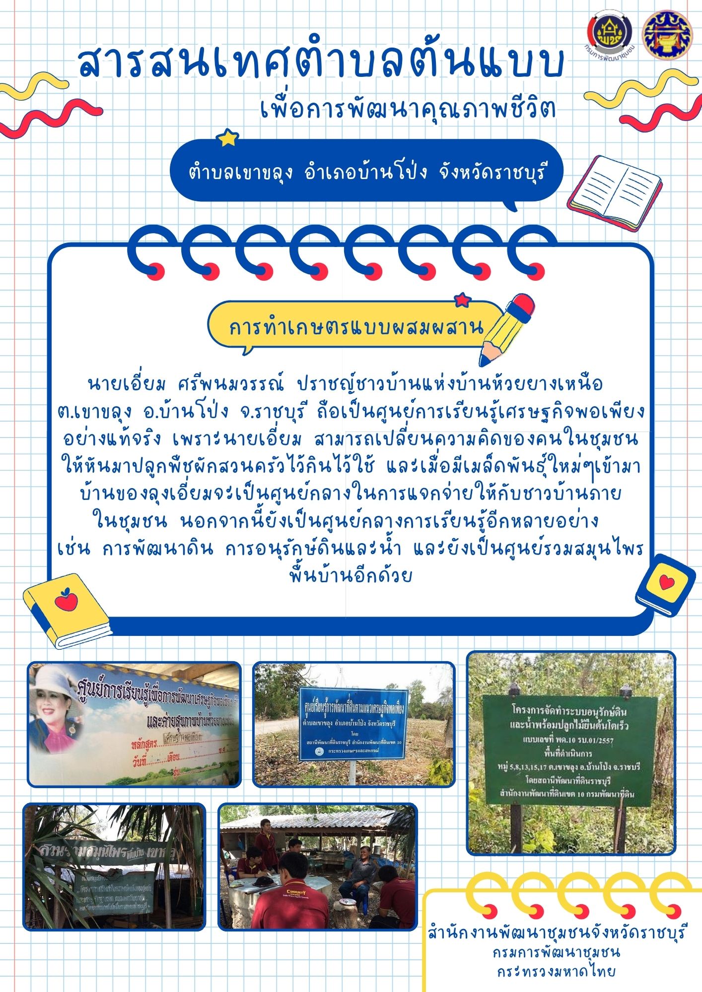 📣สพจ.ราชบุรี จัดทำสื่อประชาสัมพันธ์สารสนเทศตำบลต้นแบบเพื่อการพัฒนาคุณภาพชีวิต ประจำปี 2564 04 สิงหาคม 68 / 11:42 น. Facebook iconFacebookTwitter iconTwitterLINE iconLine การทำเกษตรแบบผสมผสาน ต.เขาขลุง อ.บ้านโป่ง จ.ราชบุรี (Visited 1 times, 1 visits today)Facebook iconFacebookTwitter iconTwitterLINE iconLine