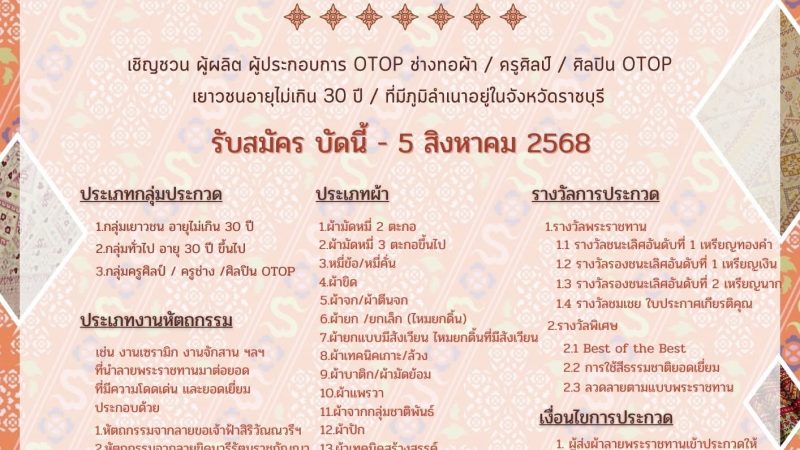 📣 พช.ราชบุรี ขอเชิญชวนผู้ผลิต ผู้ประกอบการ OTOP ประเภทผ้า และประเภทงานหัตถกรรม กลุ่มทอผ้า ช่างทอผ้า ครูศิลป์ ศิลปิน OTOP เยาวชนอายุไม่เกิน 30 ปี ที่มีภูมิลำเนาอยู่ในพื้นที่จังหวัดราชบุรี ร่วมส่งผลงาน เข้าร่วมการประกวดผ้าลายพระราชทาน “ผ้าลายสิริราชพัสตราภรณ์”