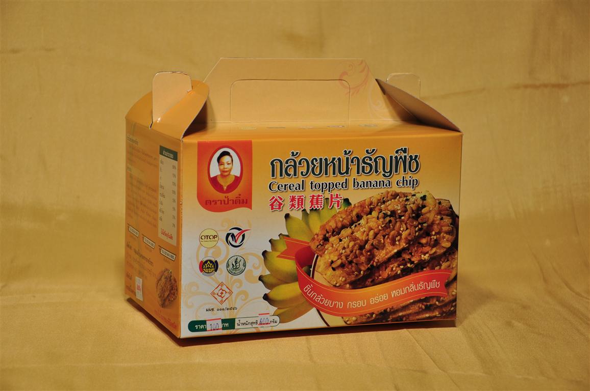 ผลิตกล้วยหน้าธัญพืช ข้าวตังหน้าธัญพืช ซึ่งเป็นผลิตผลด้านการเกษตร โดยเกิดจากการรวมกลุ่มของแม่บ้านที่ว่างจากการทำนาข้าว ได้นำความรู้ภูมิปัญญาด้านการแปรรูป สร้างรายได้ให้กับชุมชนมีแหล่งผลิตอยู่ที่ บ้านท่าต้นจันทน์ ตำบลลาดบัวขาว อำเภอบ้านโป่ง จังหวัดราชบุรีเป็นผลิตภัณฑ์ OTOP ระดับ 5 ดาว